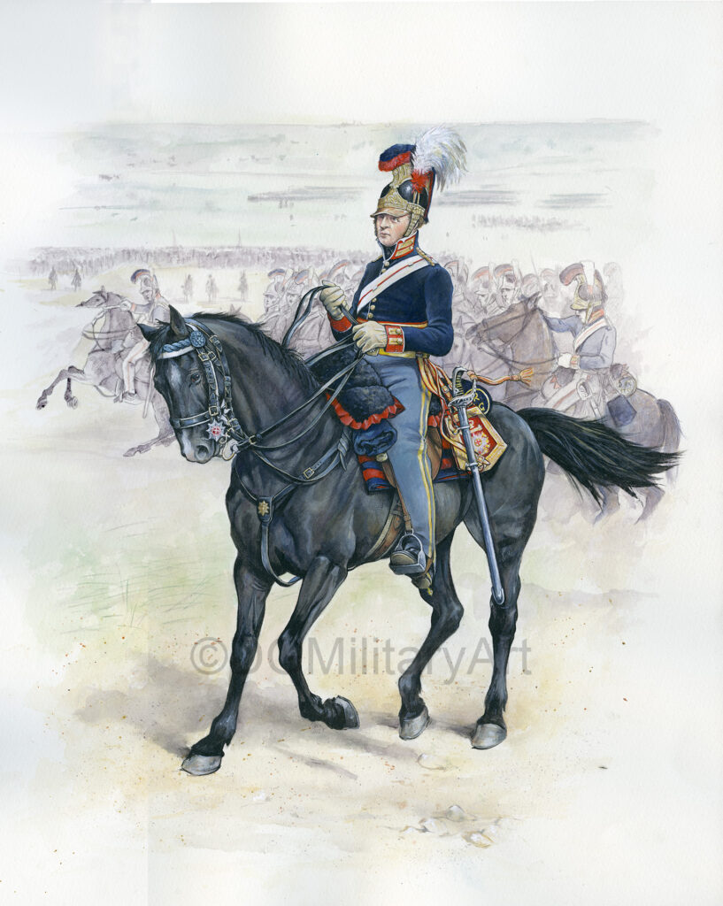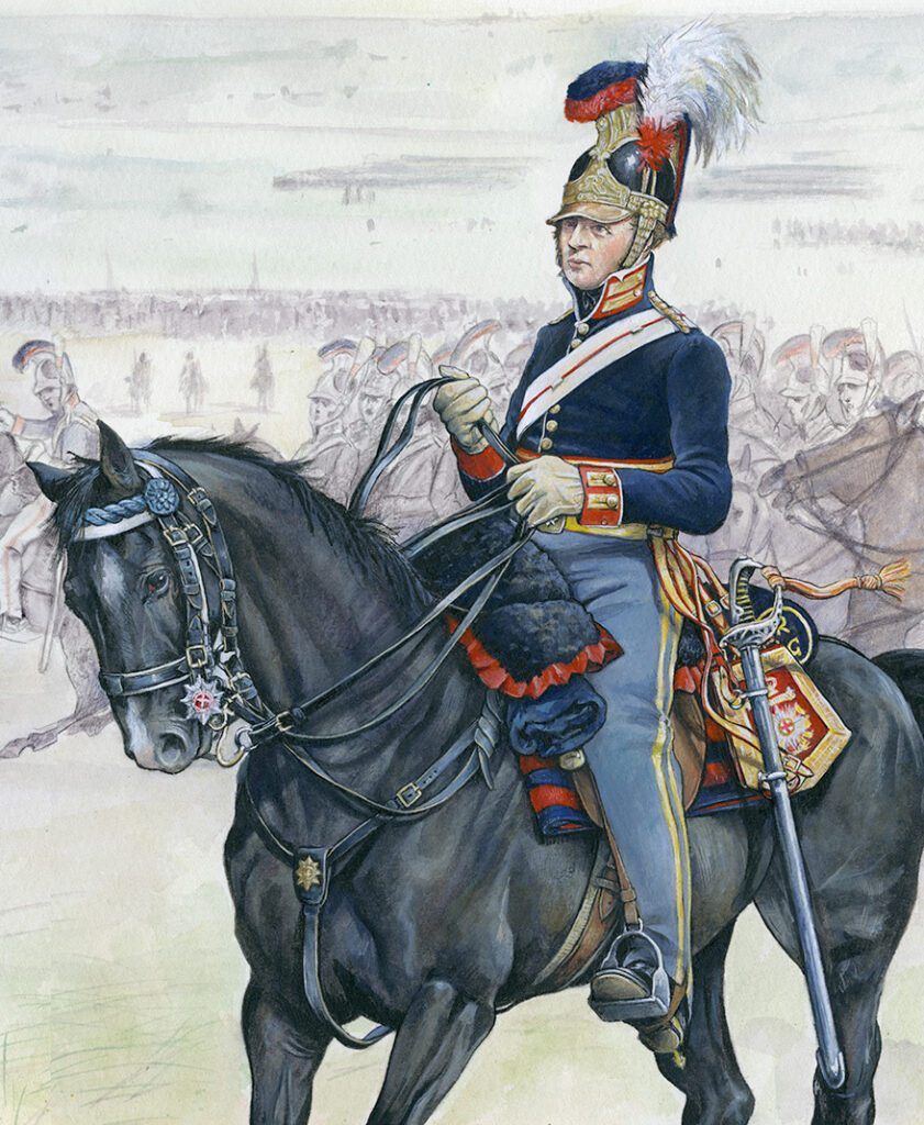 Hazlehurst is wearing the so-called Stove Pipe shako, introduced around 1800. Although by 1812 the head gear had been replaced by the ‘Belgic’ Shako, units still fighting in the Iberian Penninsula continued wearing the earlier model. The records show that Hazlehurst used his spontoon, which weapon denoted his rank, to fight off the enemy to save Captain Powys. So armed he could only have been either a centre company or grenadier company sergeant, as the light company sergeants were armed with muskets. The absence of evidence to say to which company Hazlehurst belonged, and in order to more clearly depict his rank, I decided to show him as a grenadier company sergeant, as they had stripes on both arms whilst the centre companies only had them on their right. Being in the grenadier company also meant he had wings on his shoulders instead of the simple tufts of the centre companies.